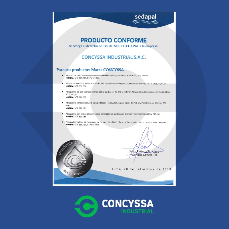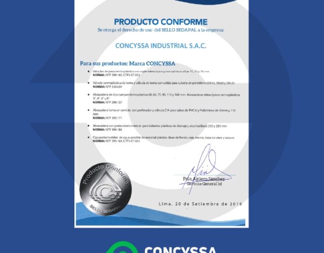 Como consecuencia de un arduo trabajo en equipo con las diversas áreas de nuestra empresa y habiendo aprobado los rigurosos criterios de evaluación, es así como el 20 de Septiembre del 2019 Sedapal nos renovó el certificado de «Producto Conforme Sello Sedapal», obteniendo la calificación «A». Esto significa que los productos de saneamiento de nuestra marca Concyssa obtuvieron una puntuación superior a 95 sobre 100 puntos.